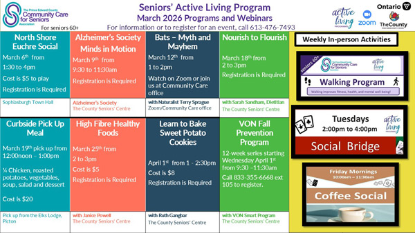 Join the County Seniors’ Centre for a series of informative webinars designed to help older adults stay informed, engaged, and living well at home. Upcoming webinars include Bats Myth and Mayhem with Naturalist Terry Sprague on Thursday, March 12. Webinar runs from 1:00 to 2:00pm on Zoom or you can join others at the County Seniors’ Centre to watch it on the big screen. Webinars run from 1:00 to 2:00pm on Zoom or you can join others at the County Seniors’ Centre to watch it on the big screen. For more information or to participate, call Prince Edward Community Care at 613-476-7493. Check the activity calendar for more activities at www.communitycareforseniors.org/events/ or email info@communitycareforseniors.org