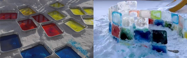 Saturday’s temperature at around -17 (-23 with wind chill) was perfect for them to quickly freeze water in aluminum pans. First they added red, blue and yellow Jello powders to colour the ‘blocks’.
